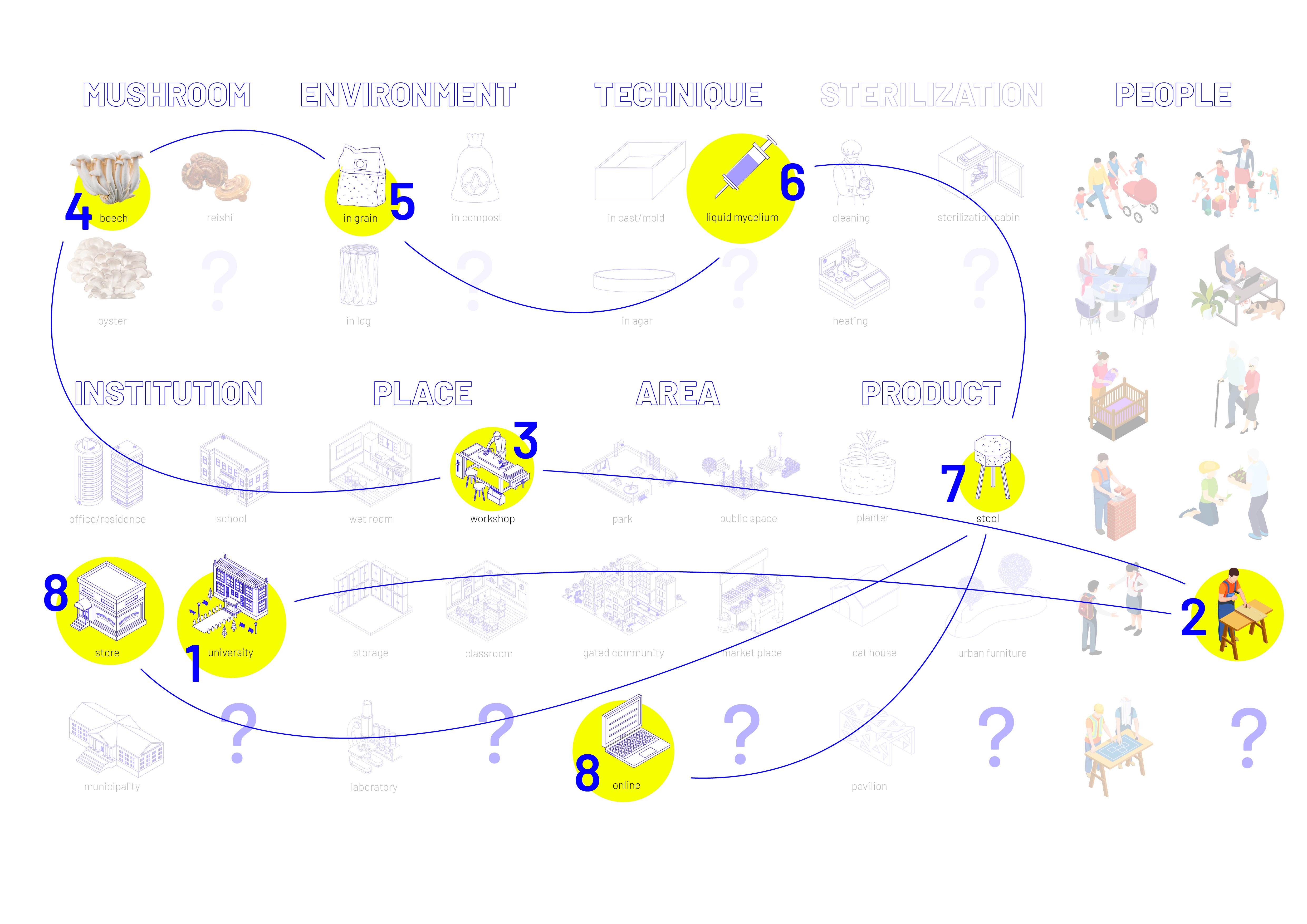 Following the panel, participants moved into a hands-on session in which they selected their mushroom type and substrates, prepared their casts and initiated their own cultivation experiments. Each participant produced two samples: one to keep at home and observe under their own environmental conditions, and one submitted to Urban Atölye for controlled monitoring. This setup allowed the research to directly compare the effect of varying domestic environments on growth outcomes. The workshop concluded with the introduction of the Collectivity Game, a card-based scenario tool developed by Urban Atölye to map the possible actors, places, institutions and products involved in community-scale mycelium production.