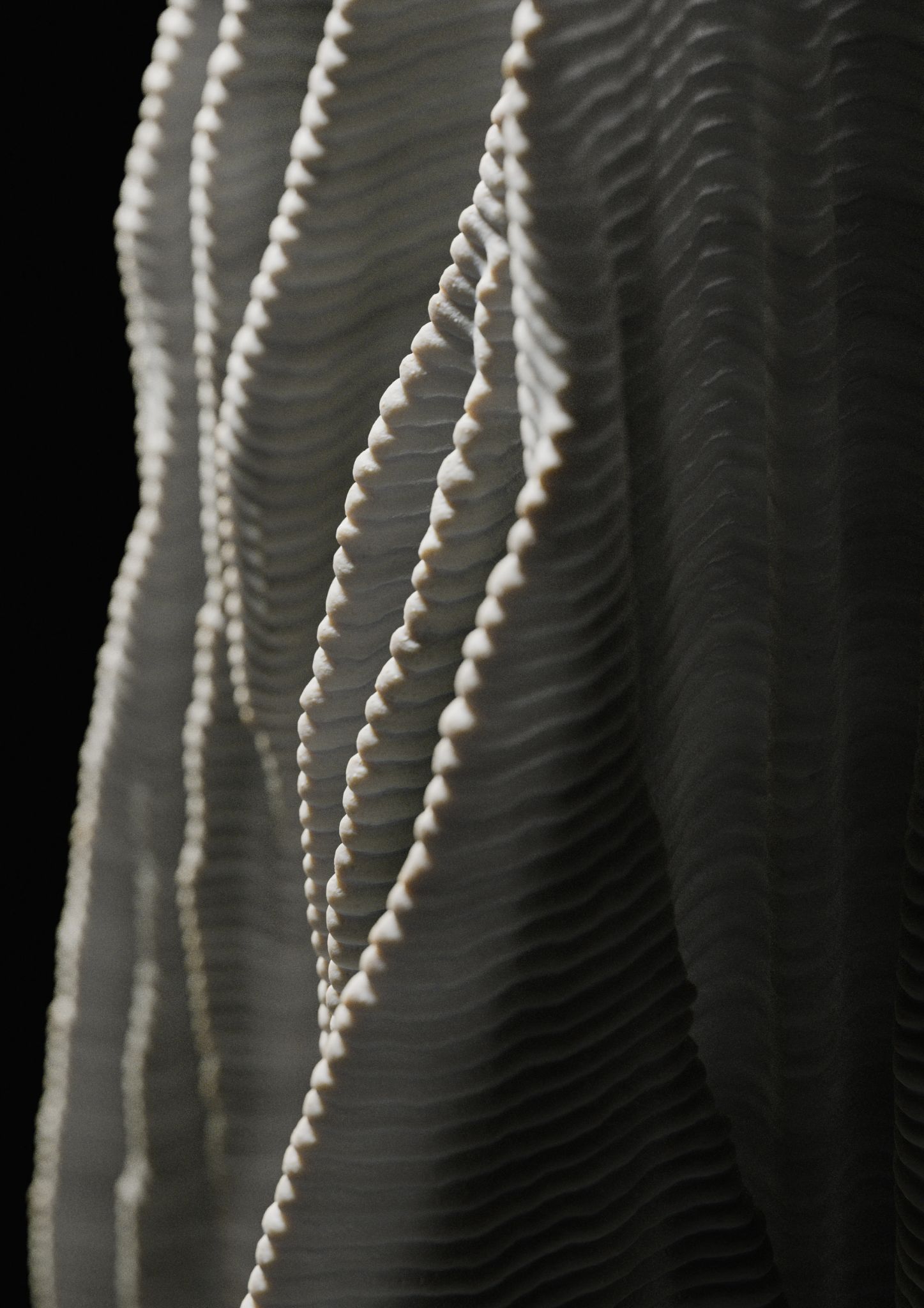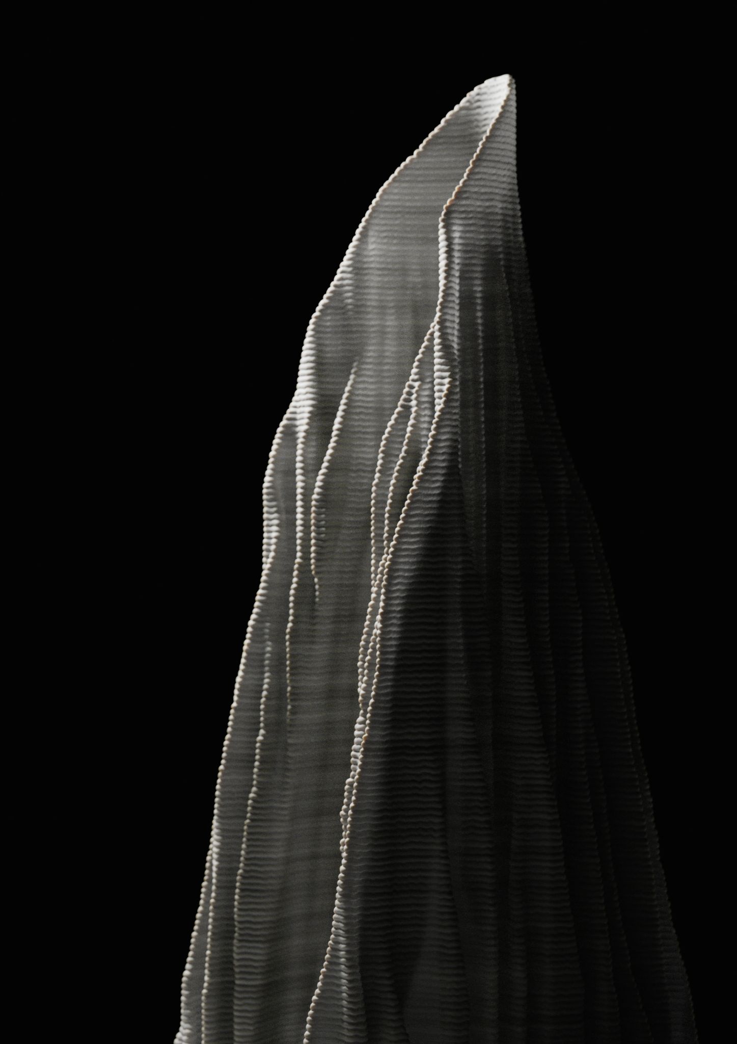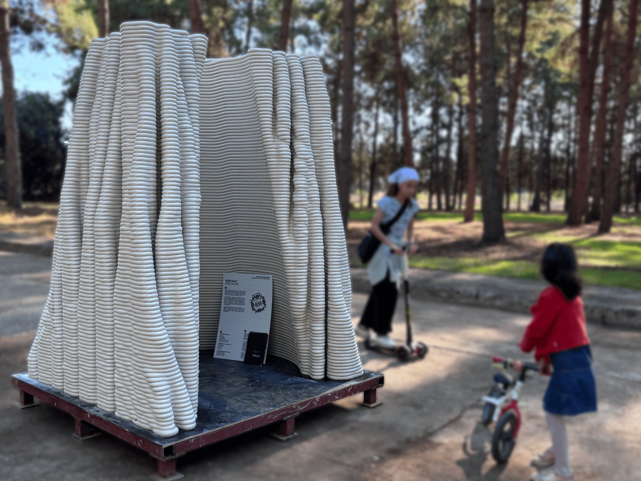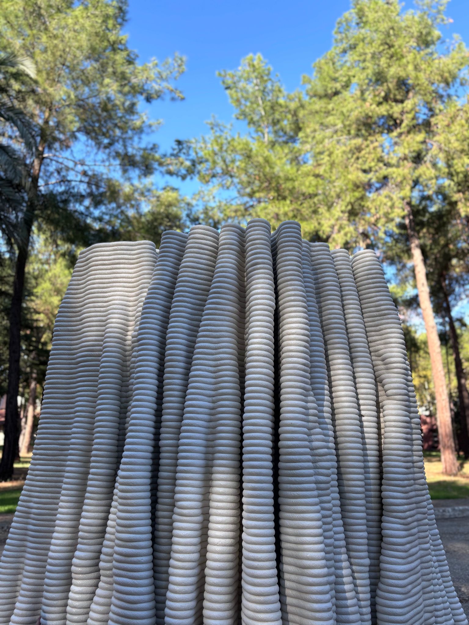 A'osis Falesie distinguished itself from previous episodes in the series through two specific characteristics. The model approaches the "cıdar," the wall condition of the tubular structure, as a loose pattern in plan rather than a resolved surface, then plays with the vertical pull and horizontal flow of the "falez," or cliff, configuration in its layering. These two moves together produce a form that reads simultaneously as geological deposit and spatial membrane, accumulating upward through a logic closer to sedimentation than construction. The work was 3D printed in concrete by a local company using robotic concrete printing technology, with various parametric models tested through the process.