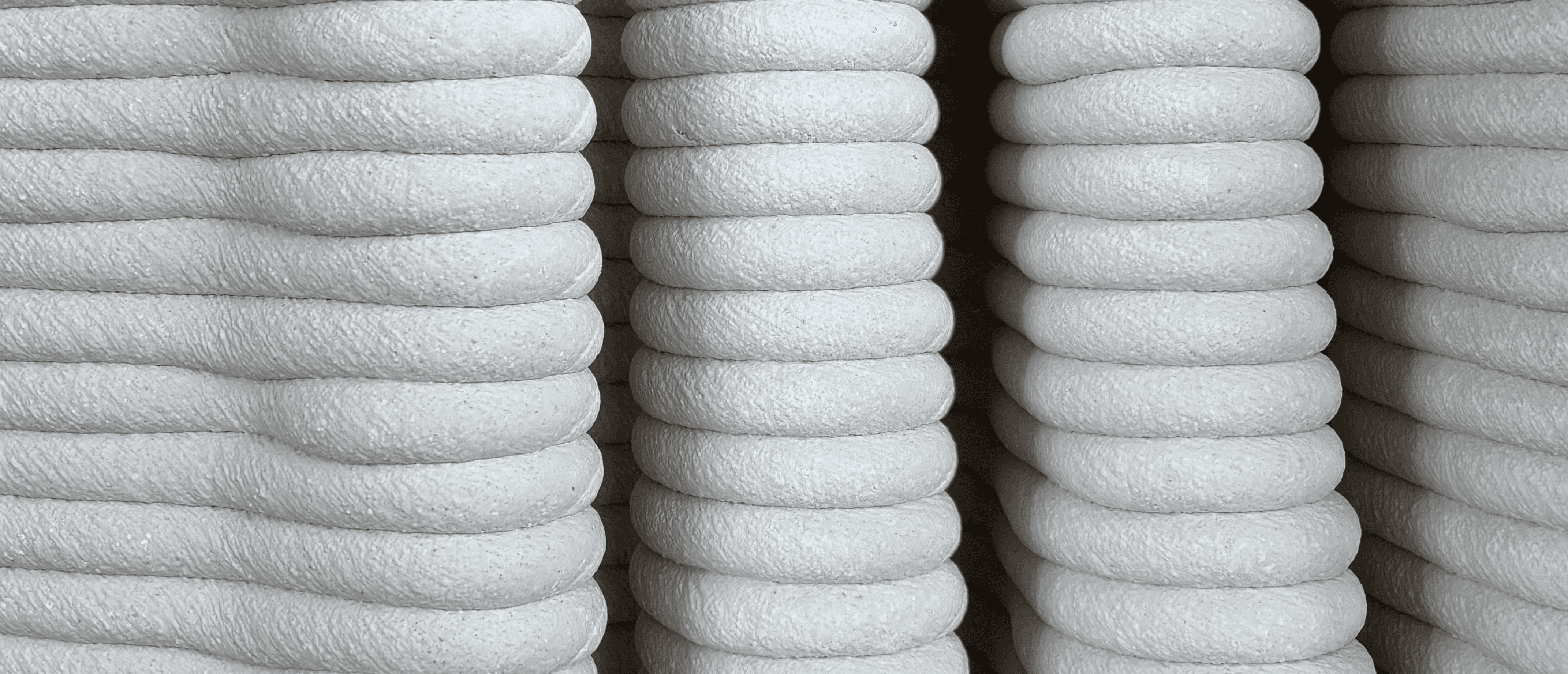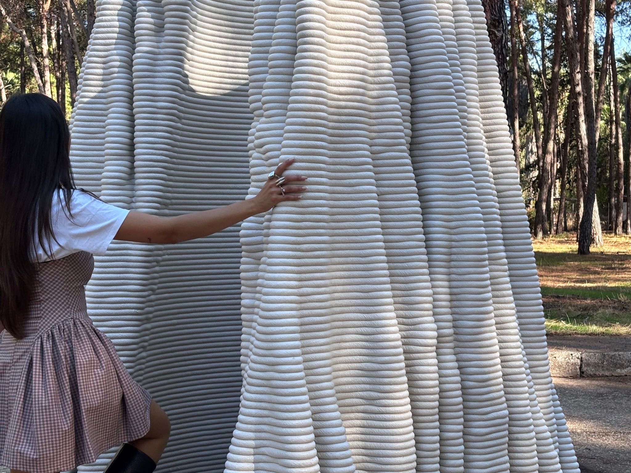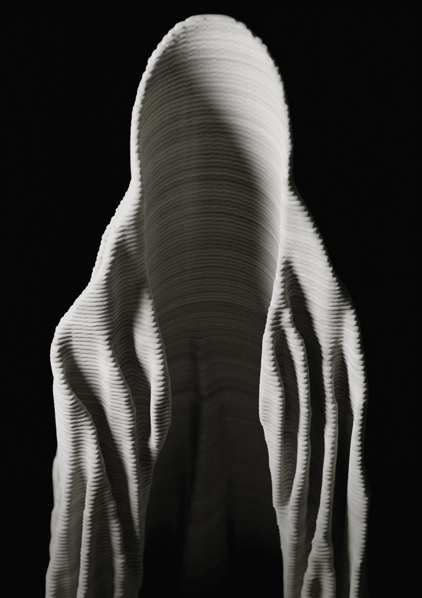 A'osis Falesie distinguished itself from previous episodes in the series through two specific characteristics. The model approaches the "cıdar," the wall condition of the tubular structure, as a loose pattern in plan rather than a resolved surface, then plays with the vertical pull and horizontal flow of the "falez," or cliff, configuration in its layering. These two moves together produce a form that reads simultaneously as geological deposit and spatial membrane, accumulating upward through a logic closer to sedimentation than construction. The work was 3D printed in concrete by a local company using robotic concrete printing technology, with various parametric models tested through the process.