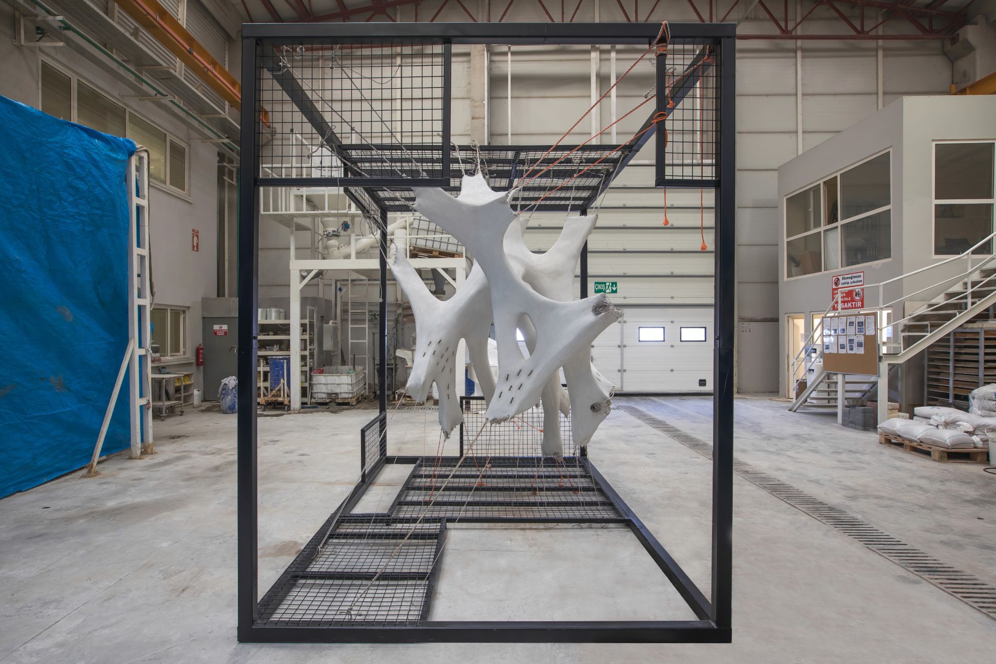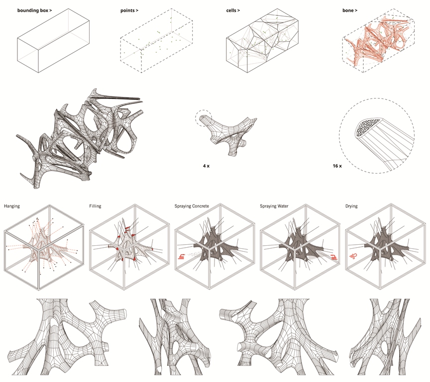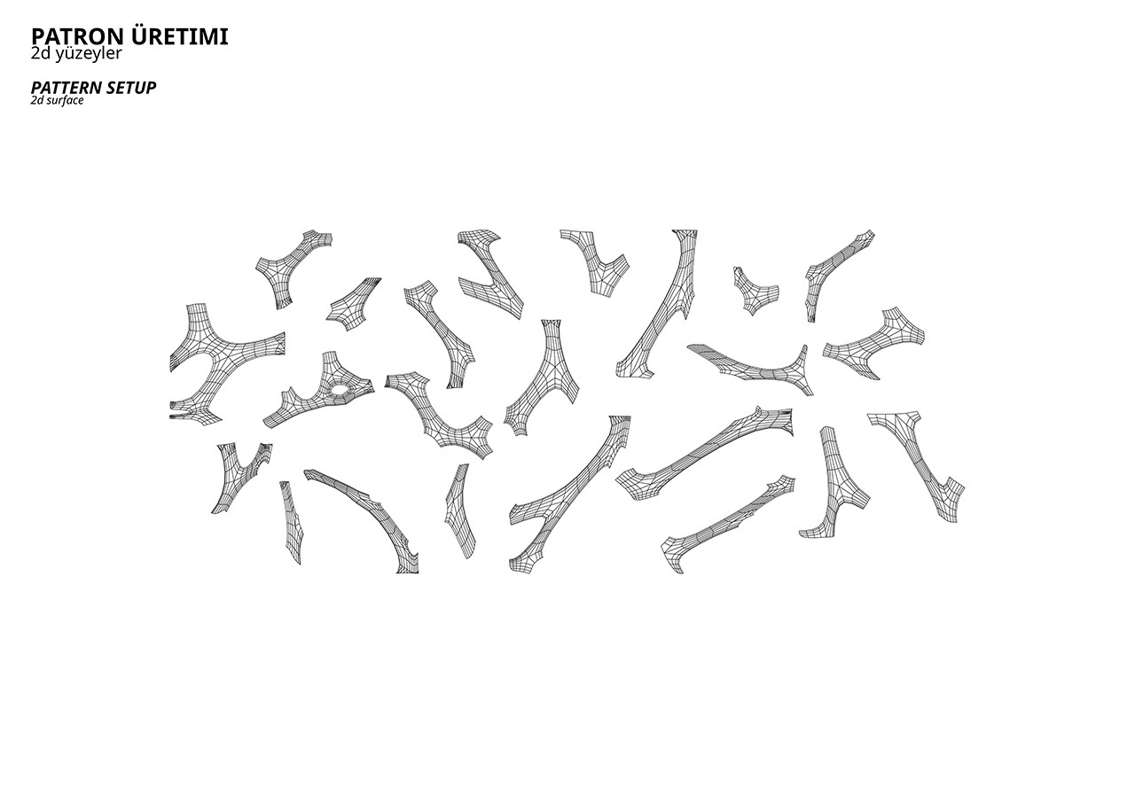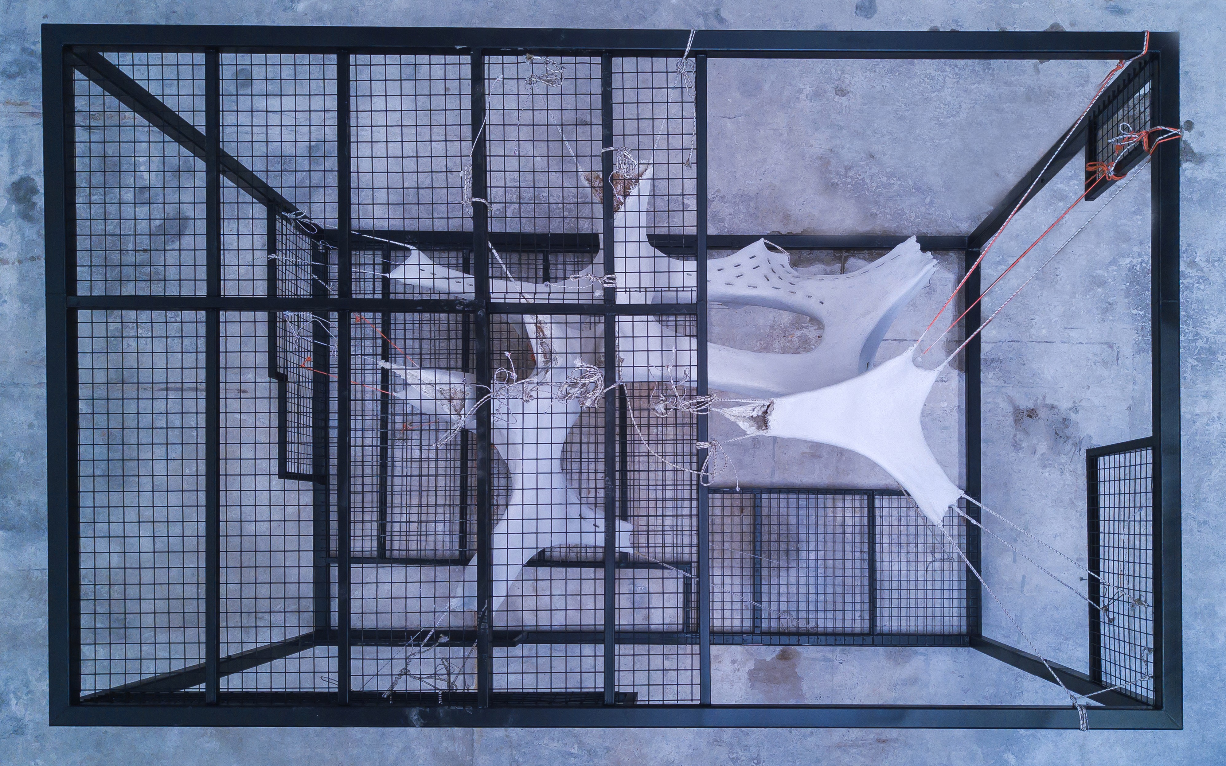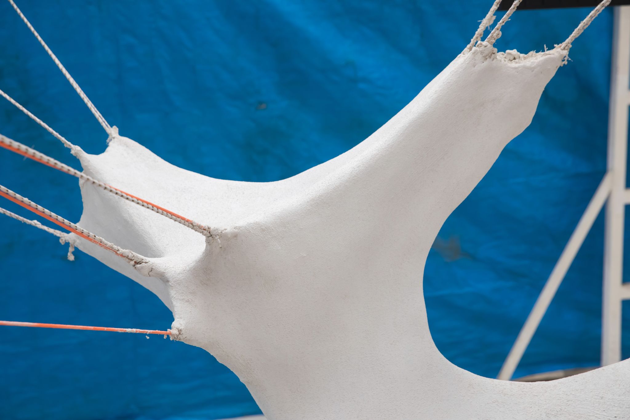 The fabrication method is as much a part of the work as the form itself. Fabric molds, derived automatically from the digital model through a generative process based on Voronoi mesh partitioning, are suspended from a metal framework and stretched under their own weight. Concrete is then sprayed onto the fabric surface in layers, conforming to gravity as it builds up, until the shell achieves structural integrity and is released from the frame. The result is a continuous, hollow, tubular skin: a networked shell in which every element carries load and the whole is active. The hollowed interior was filled with a mixture of mycelium and sawdust. The installation was positioned in the shade of trees in Karaalioğlu Park in Antalya, its apertures oriented north; within approximately three weeks, mushrooms had emerged through the openings in the surface. The structure was watched rather than managed: the form creates the conditions, and the living matter responds.
