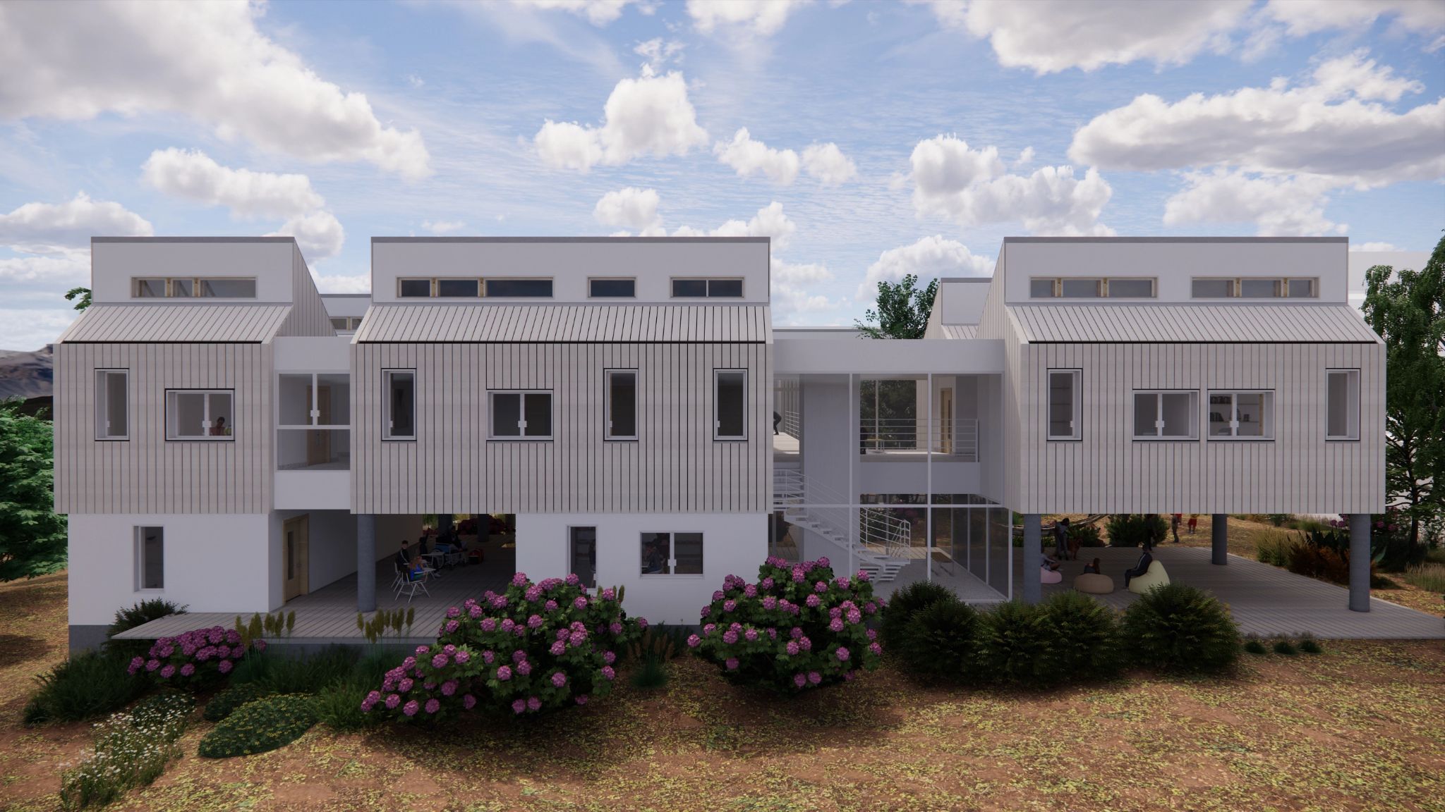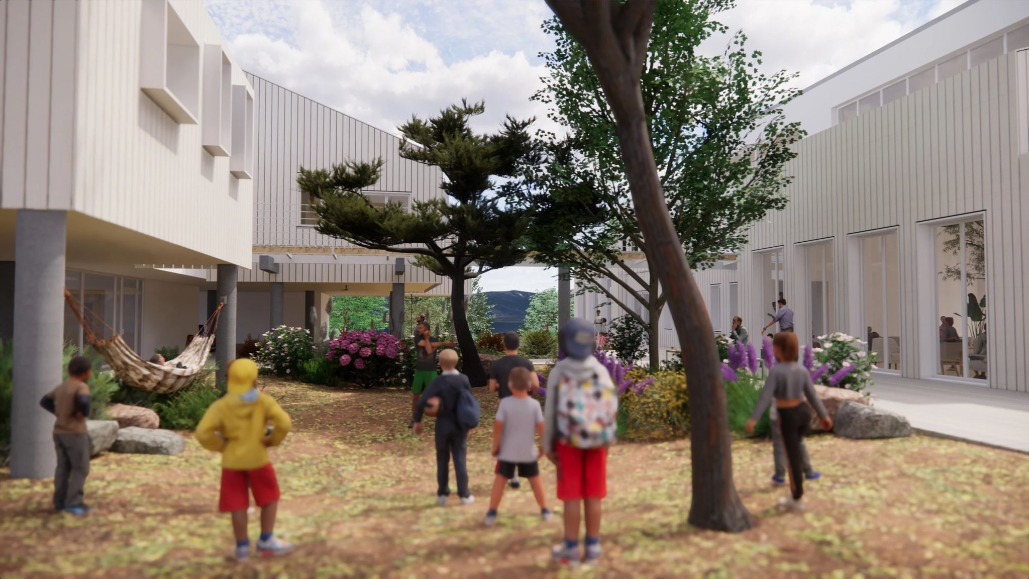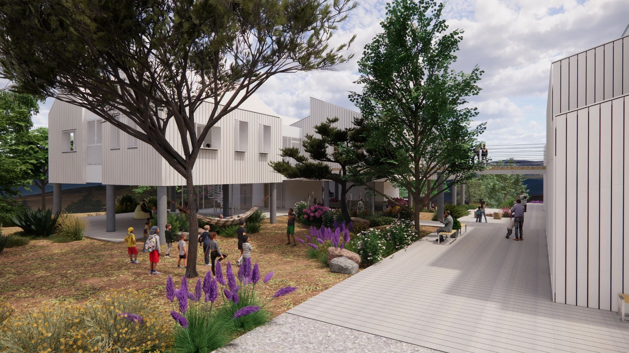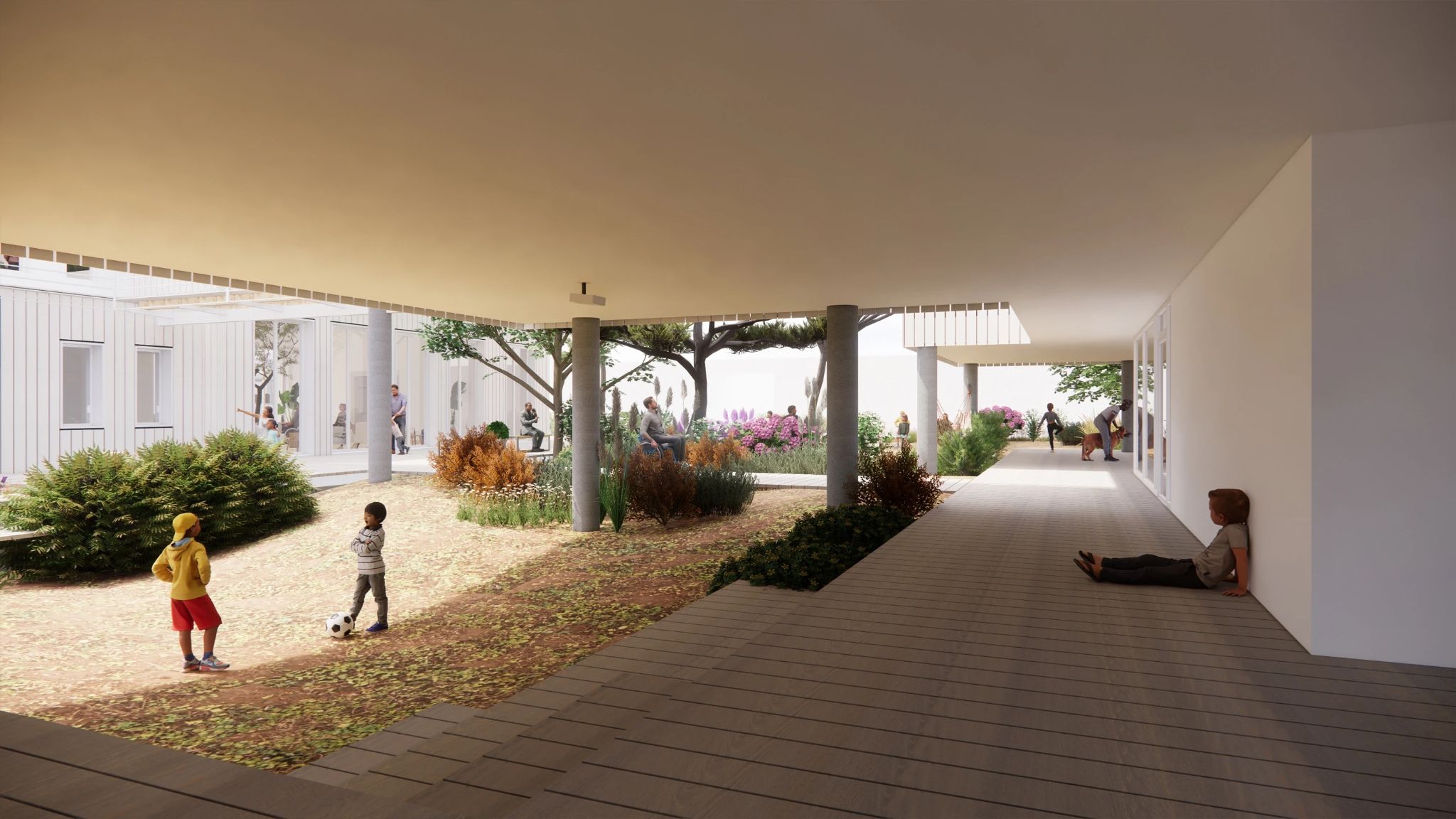 The architecture extends into the landscape through courtyards, shaded outdoor areas, and garden pathways, ensuring that the experience of nature is not merely an adjacent condition but an inherent part of daily life.