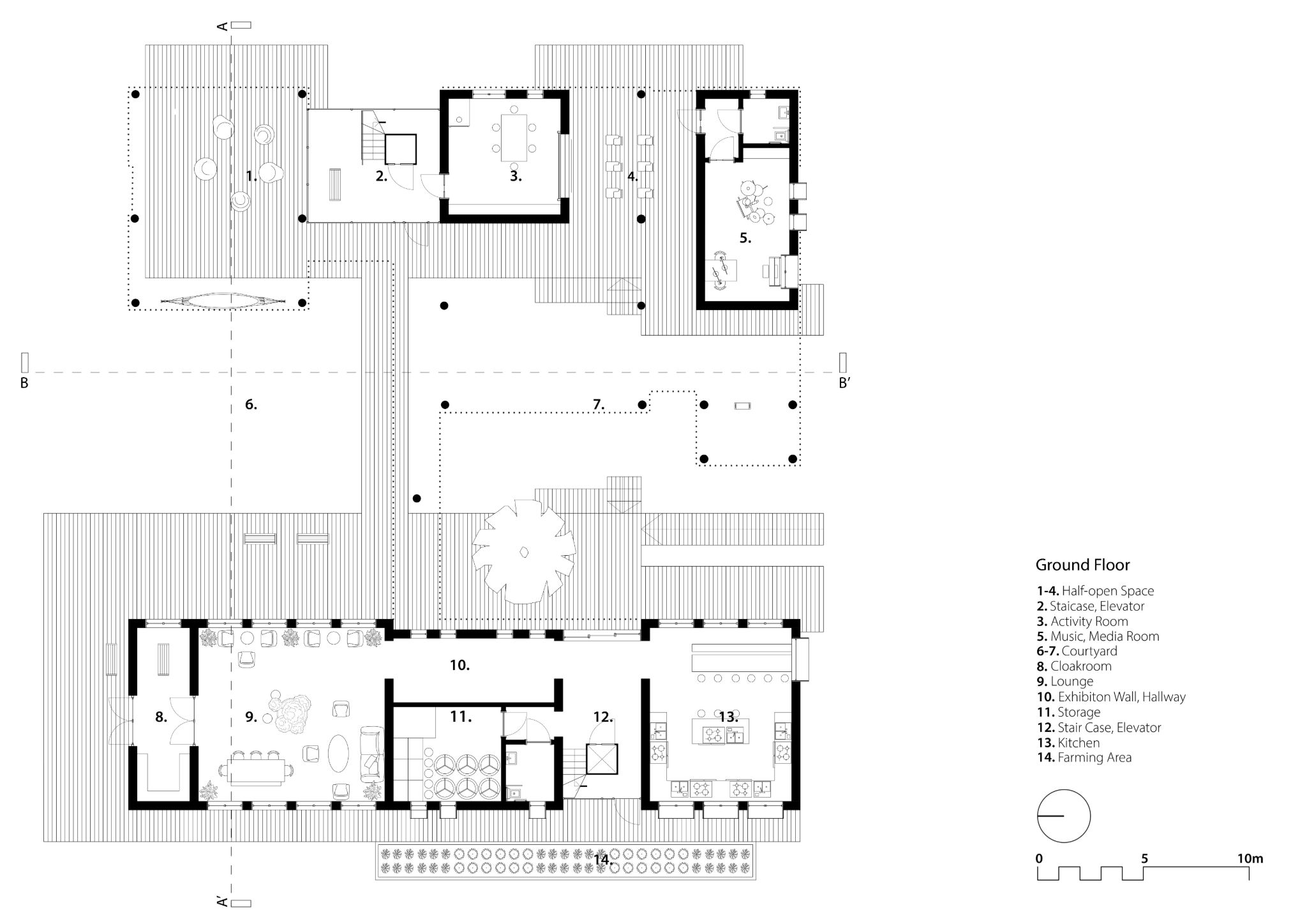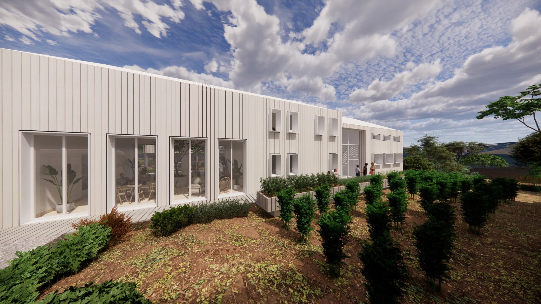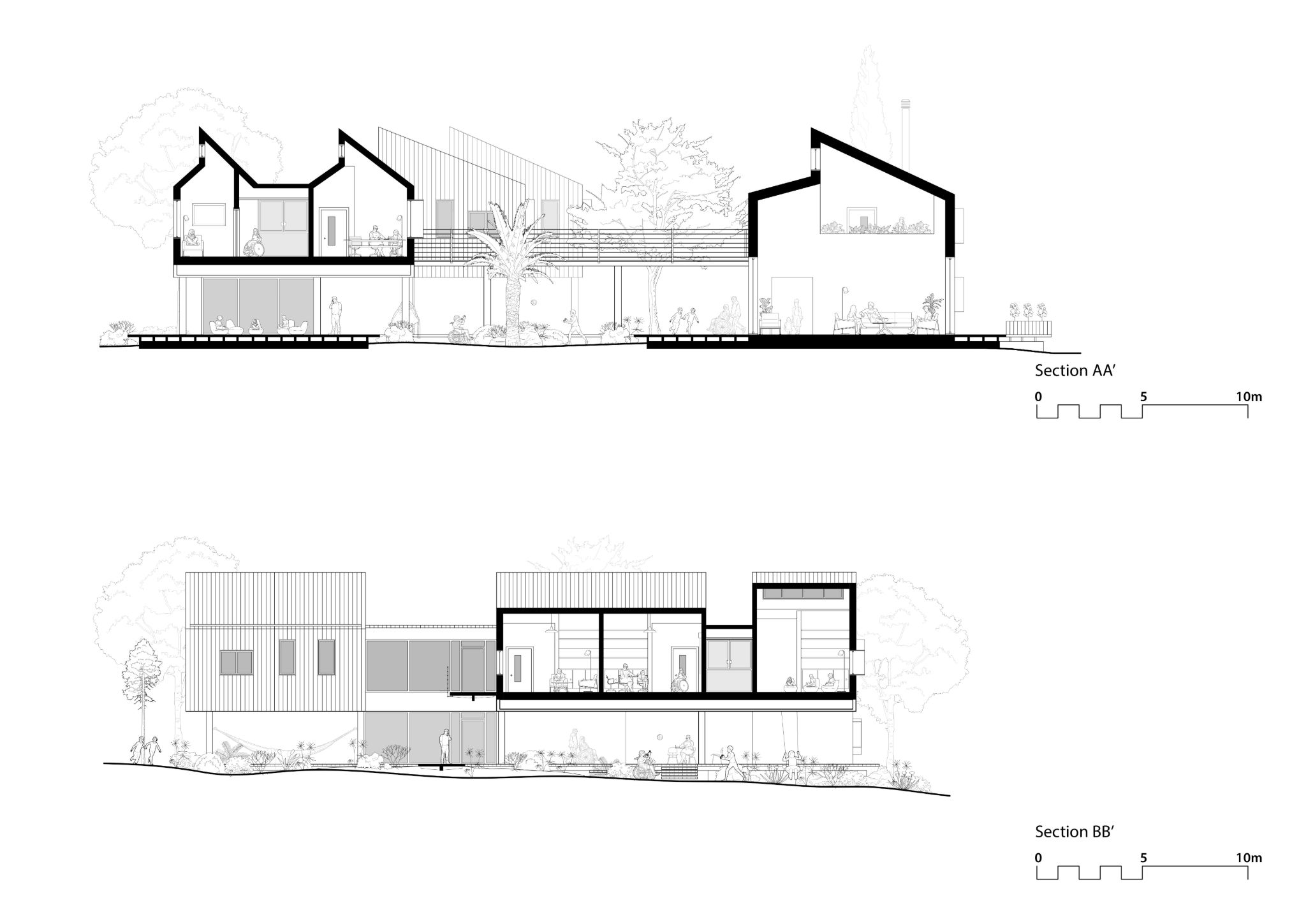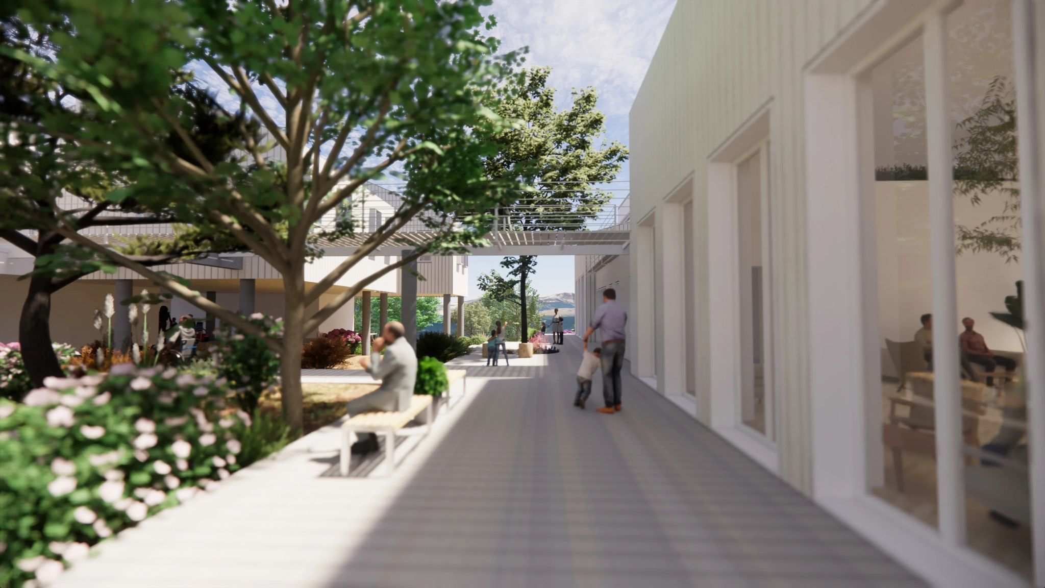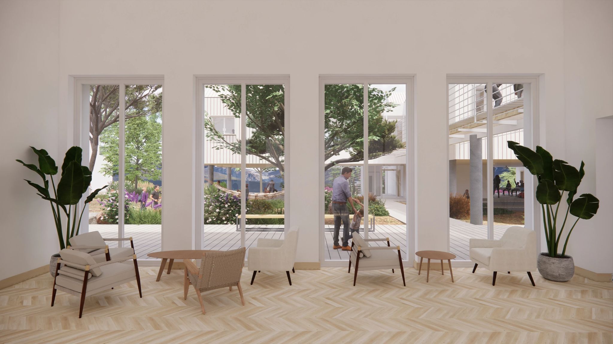The architecture extends into the landscape through courtyards, shaded outdoor areas, and garden pathways, ensuring that the experience of nature is not merely an adjacent condition but an inherent part of daily life.
