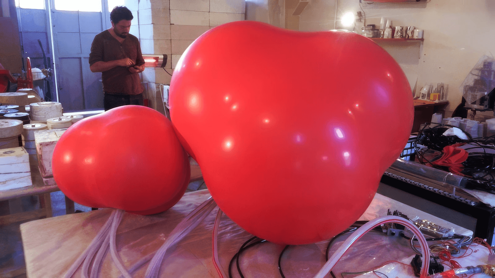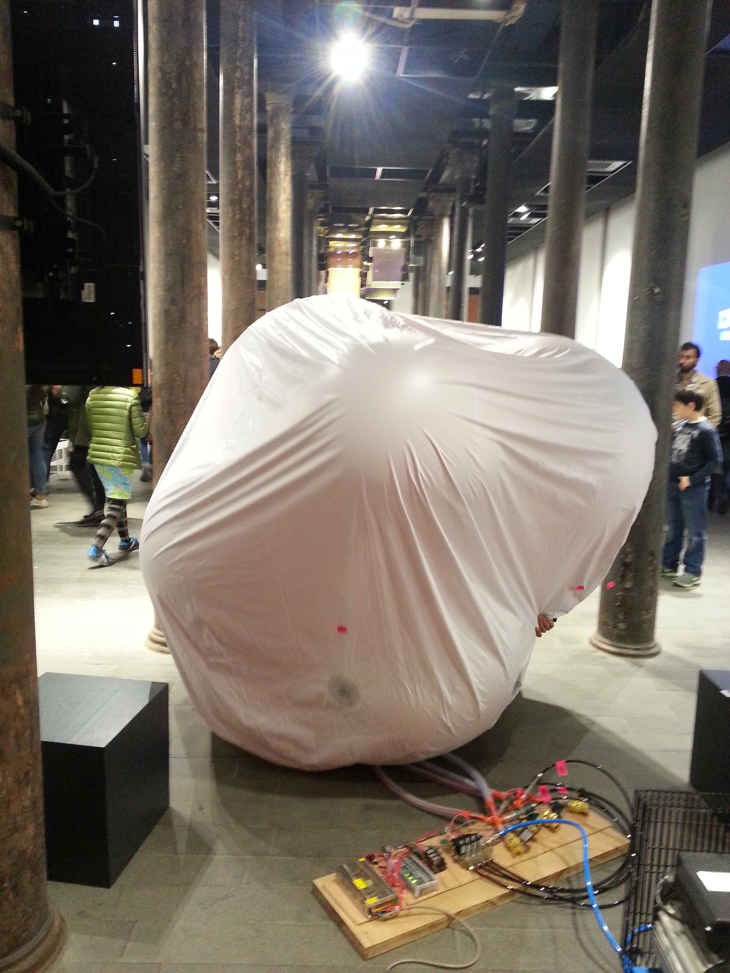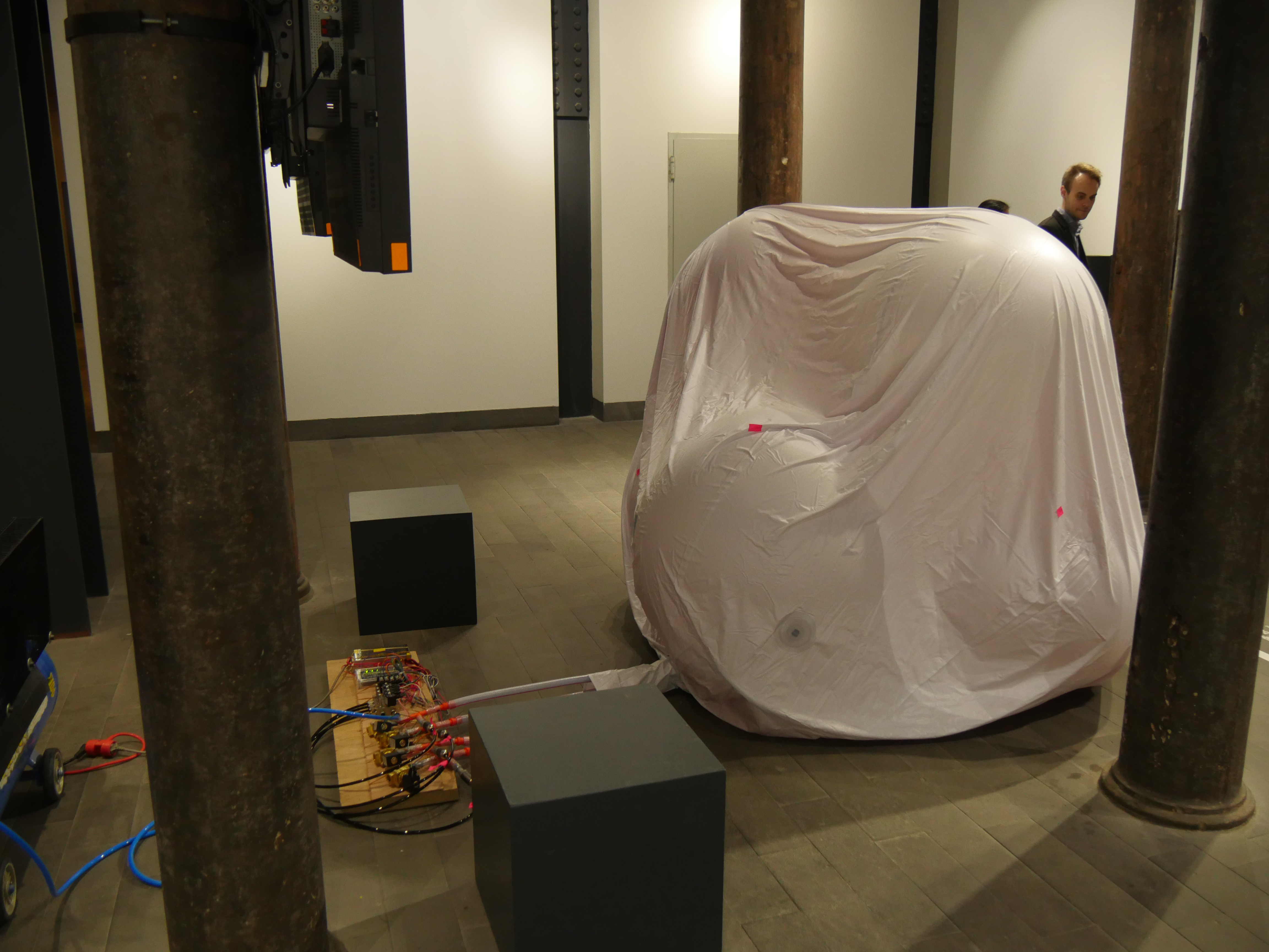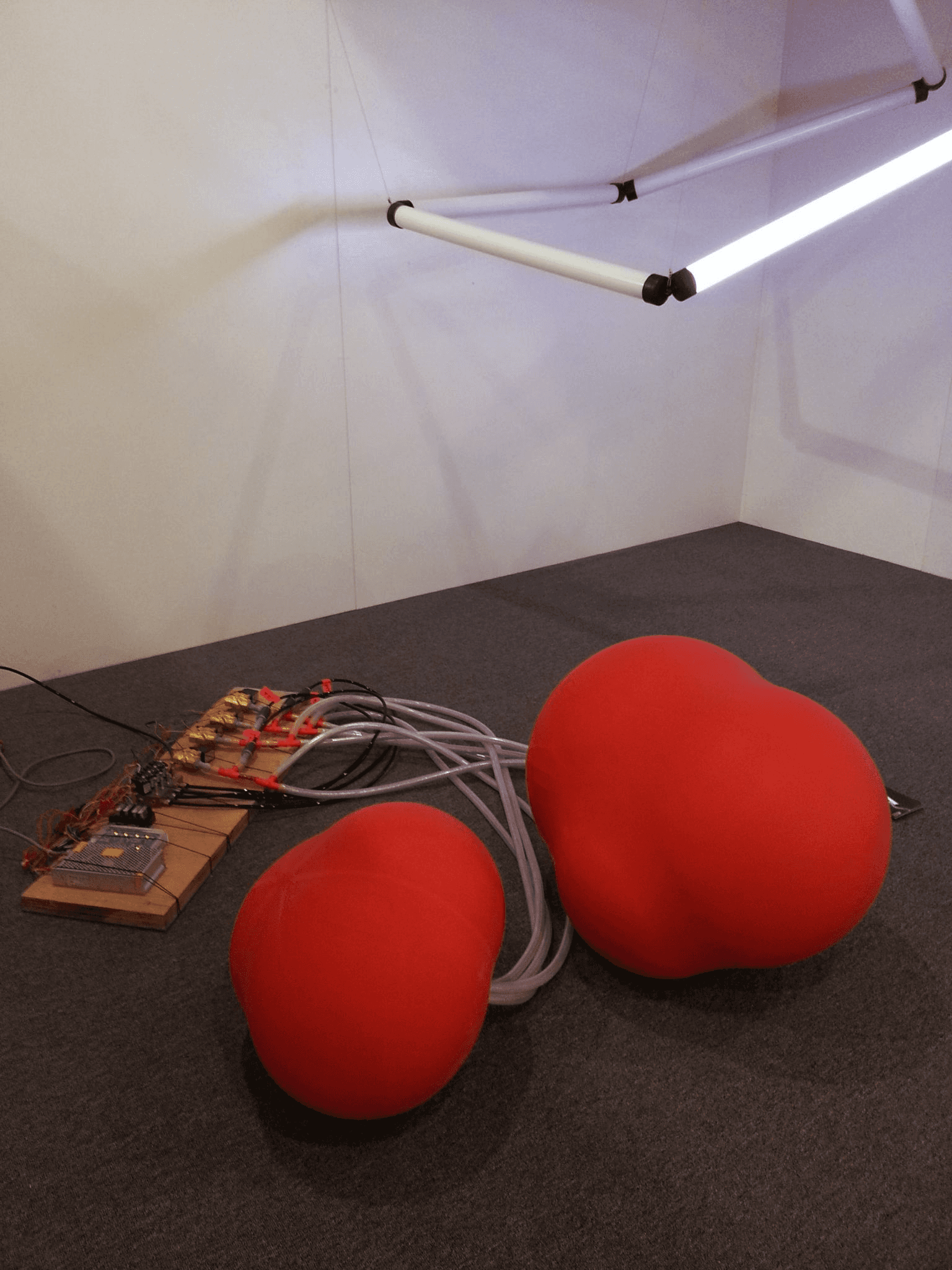 "Inflated Duo" is a captivating installation that invites viewers into a dialogue about connection, pressure, and the intricate balance of systems. Exhibited at the Contemporary Art Fair in Istanbul in 2014, this work features two large balloons, each containing four smaller interconnected balloons, all linked by flexible tubes. The installation operates through a sophisticated switchboard controlled via an app, allowing for real-time manipulation or a preset scenography of the air distribution from one compressor.