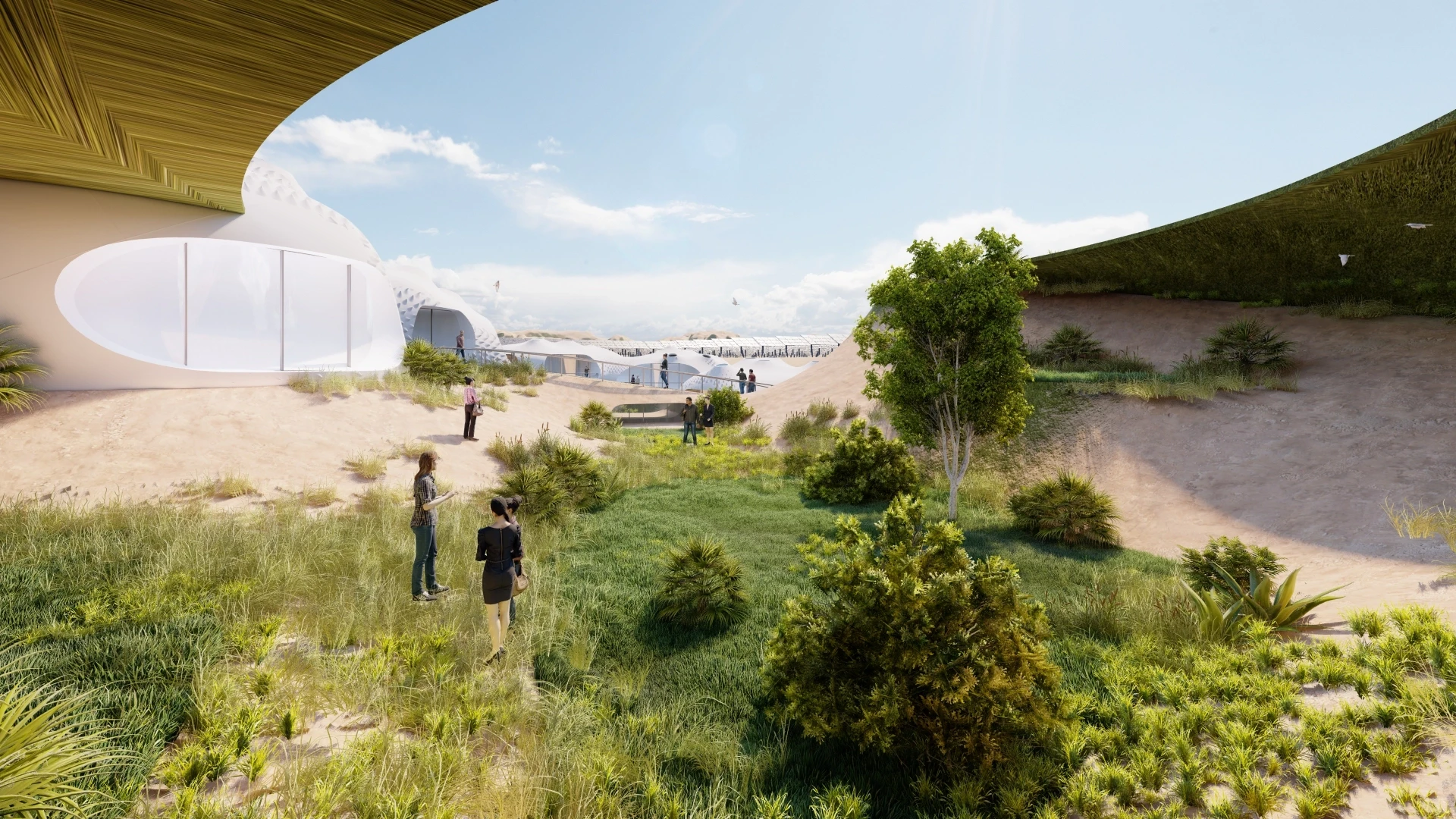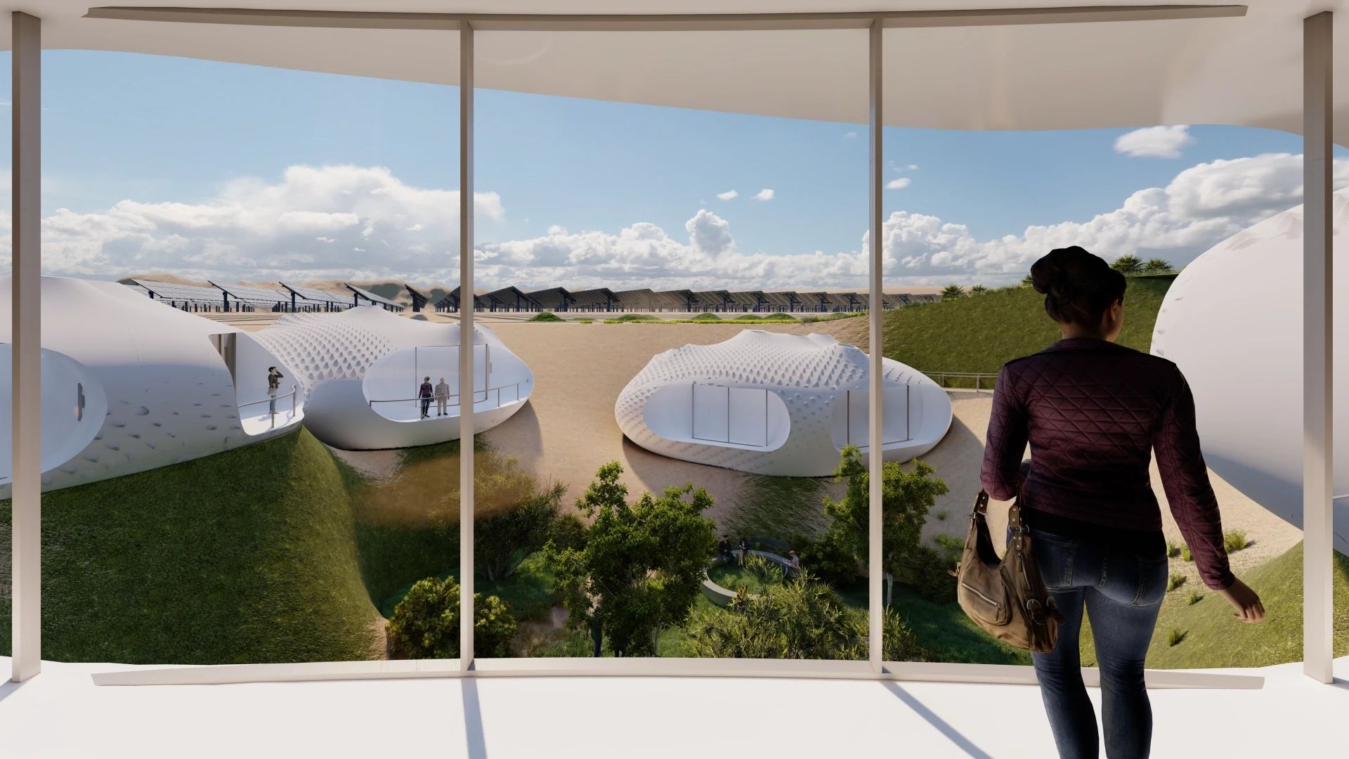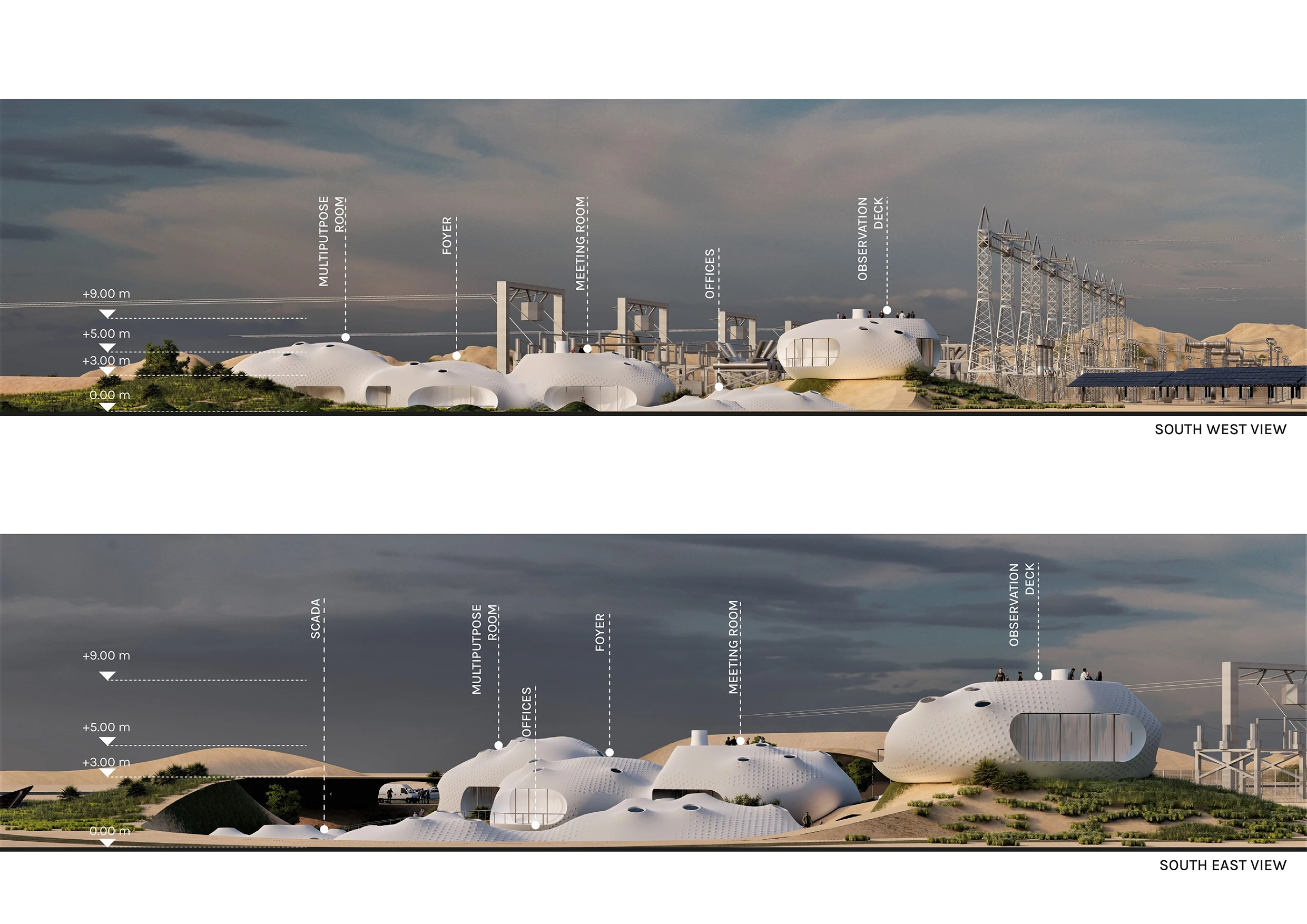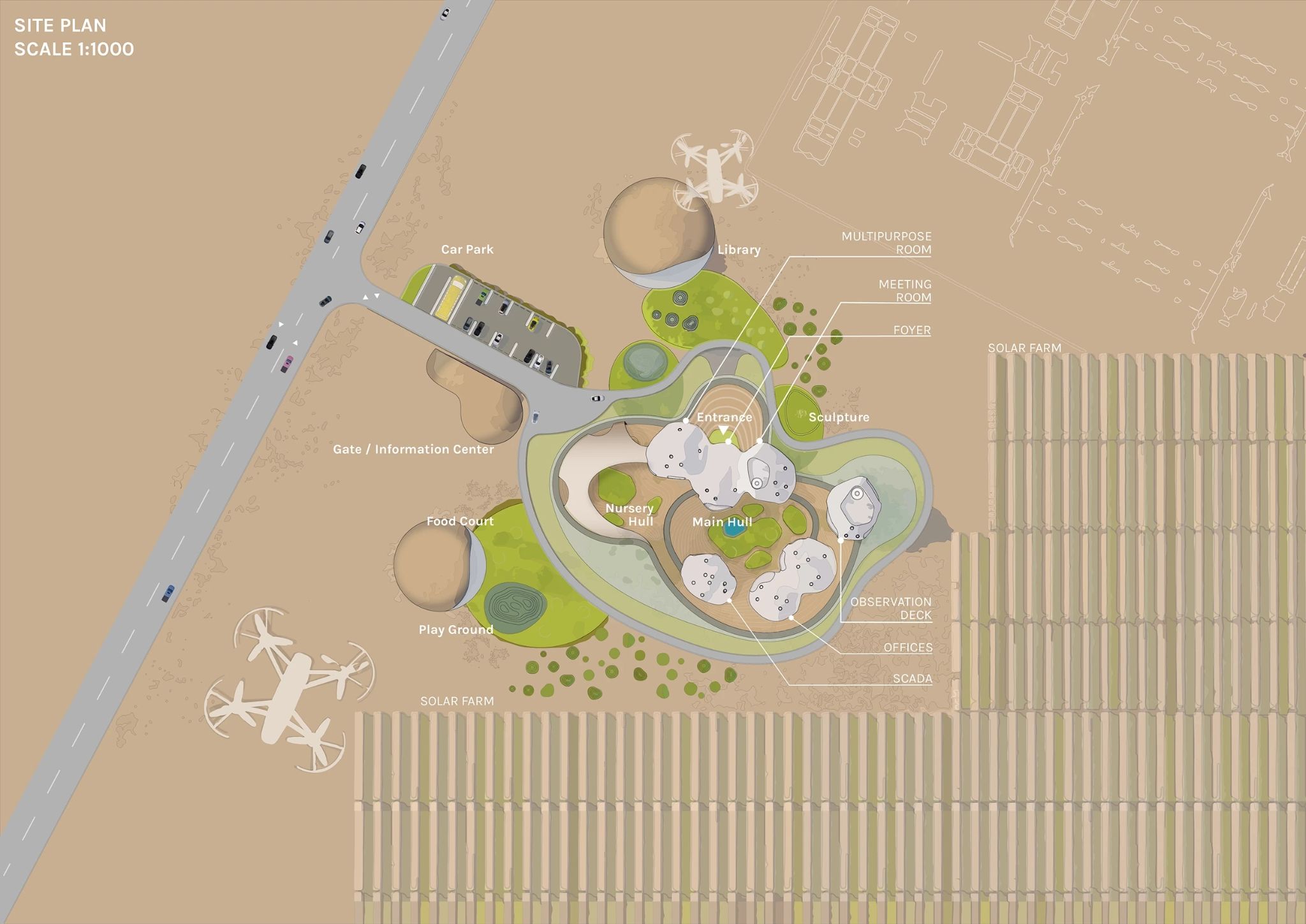 The SOLARK SCADA and Research Center, awarded the Honorary Mention, is a renewable energy facility and Sustainability Knowledge Hub set within Türkiye's only desert, in Konya. Conceived as a contemporary Noah's Ark, the project takes the form of a distributed campus of capsule-like modules, some above ground and some buried, embedded into the terrain through parametric design and innovative construction. The center serves as a control point for solar, wind, and water infrastructure while hosting an expanding community of researchers, students, educators, and local residents engaged in programs ranging from advanced agriculture to environmental resilience.