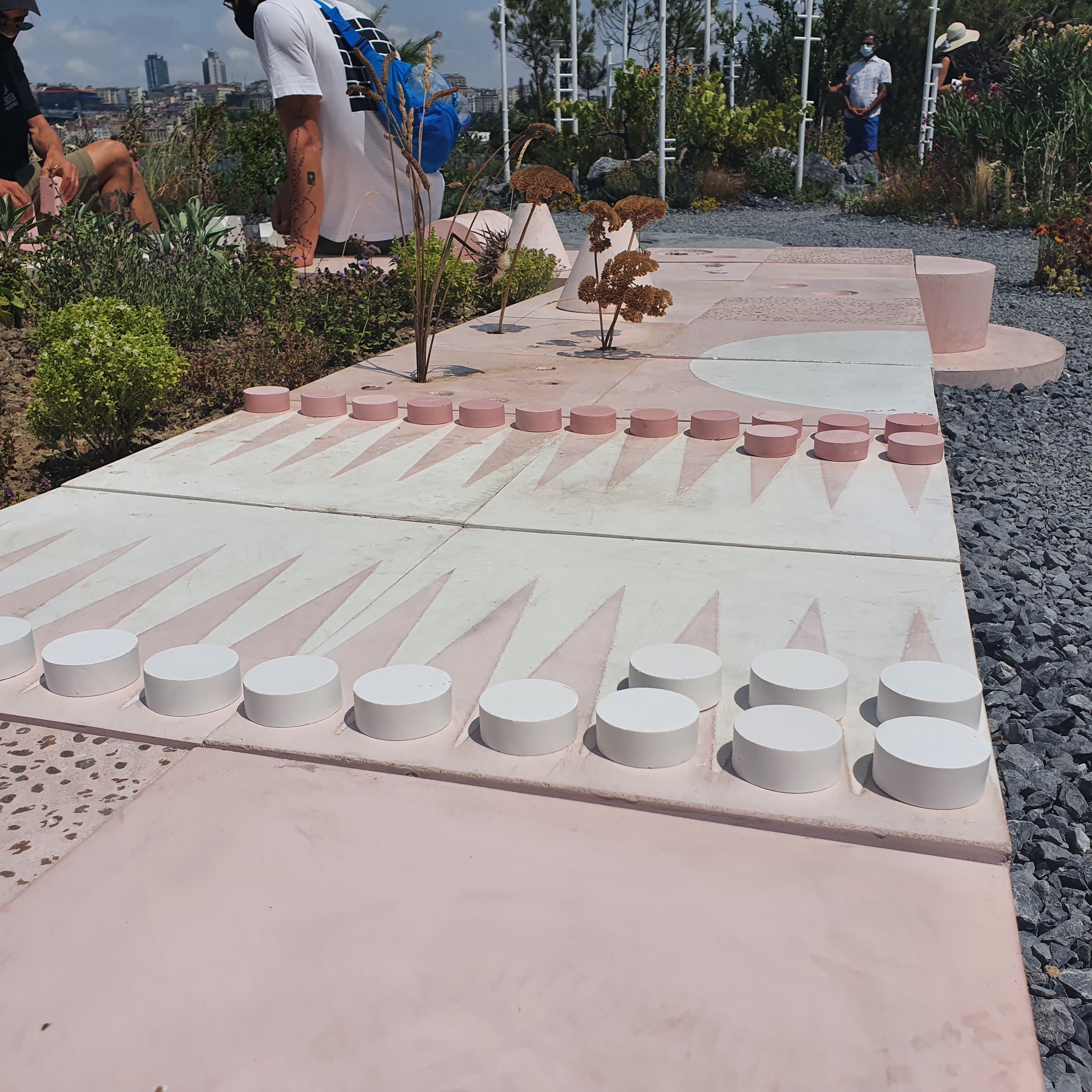 Urban Atölye was responsible for the full concrete production of the Büyükada Songlines installation, realized for the The 5th Istanbul Design Biennial, titled Empathy Revisited: Designs for more than one, 2020, to 2021, curated by Mariana Pestana. Working from detailed specifications developed by Studio Ossidiana, the team fabricated over 100 individual concrete blocks, tiles, and sculptural elements that together formed the earthly platform of the floating garden. Each piece was cast using custom formwork techniques, incorporating a range of surface treatments including washed-out finishes, expanded clay polished surfaces, soil-cast textures, shell terrazzo insertions, and iron oxide pigmentation. The platform served as the material foundation of the installation, carrying loose red soil from the islands, herbal plants, volcanic concrete forms, concrete pillows, and vial insertions for live plant specimens.