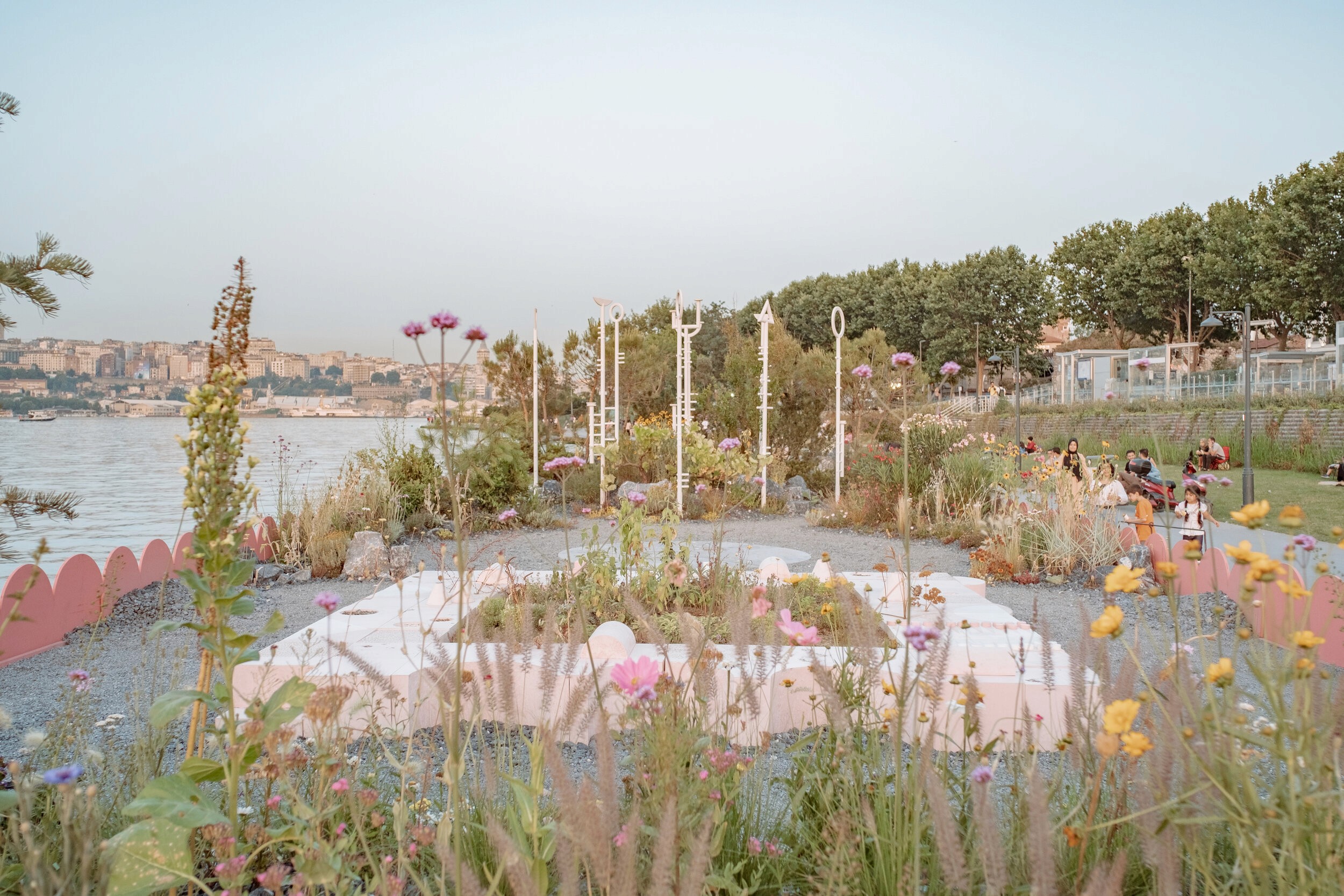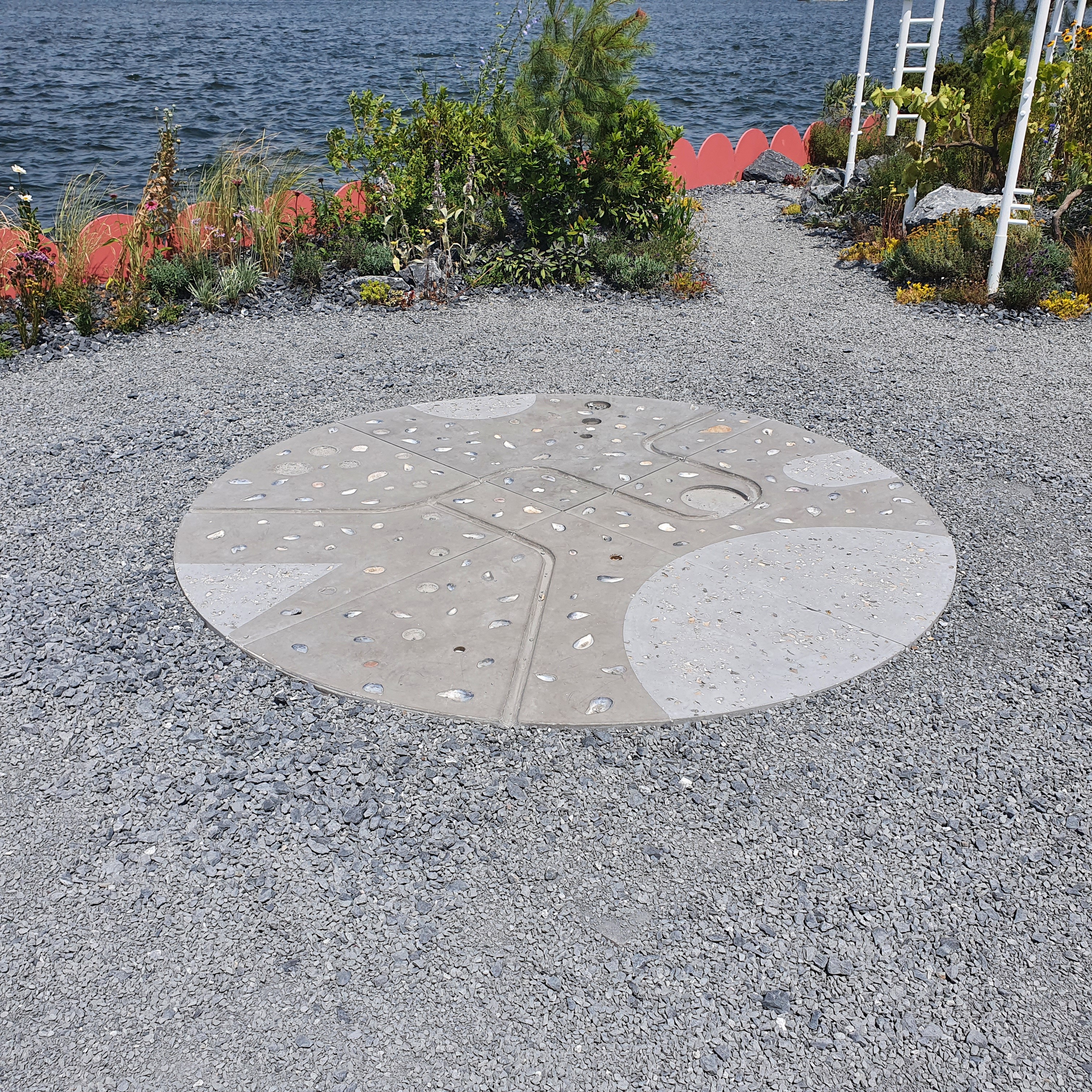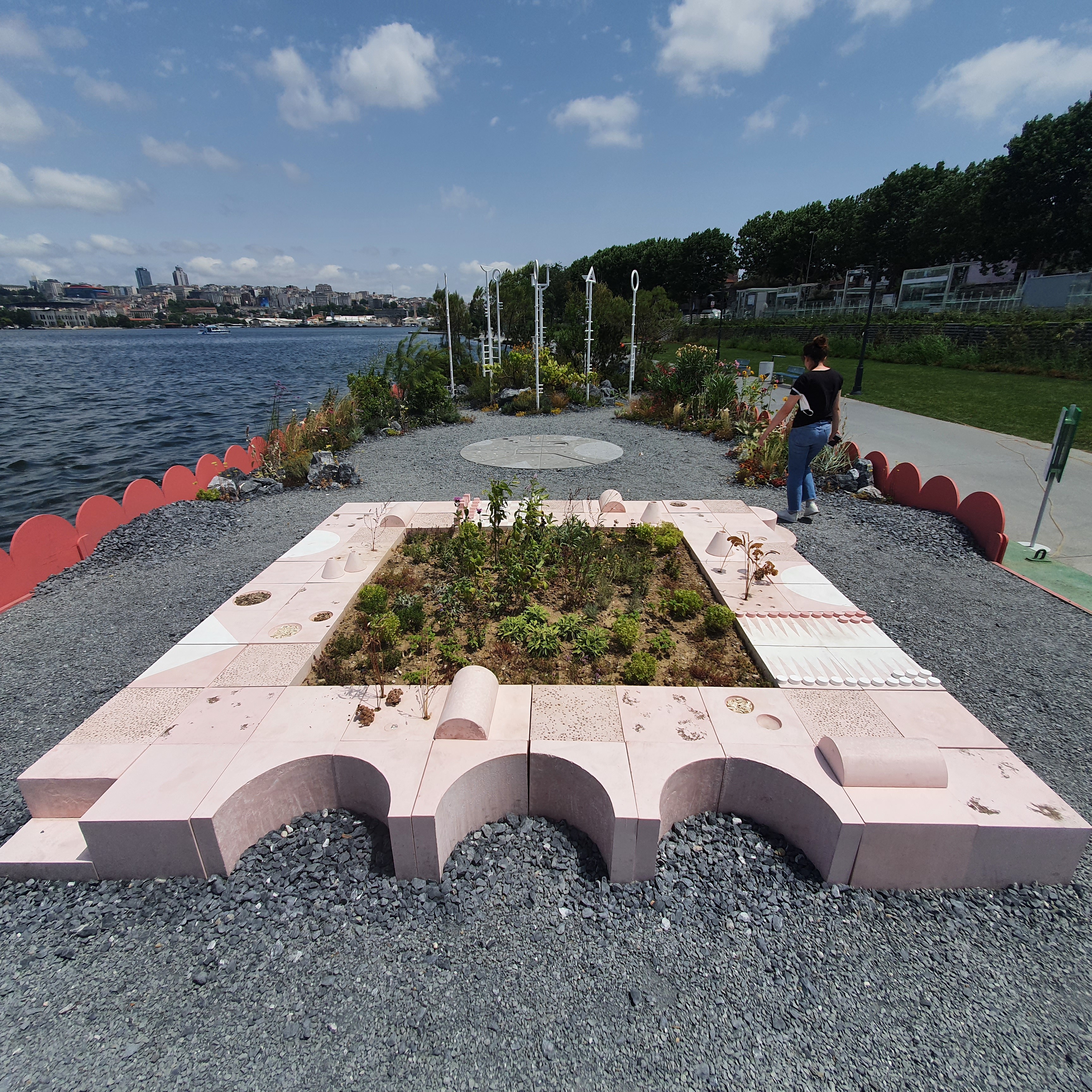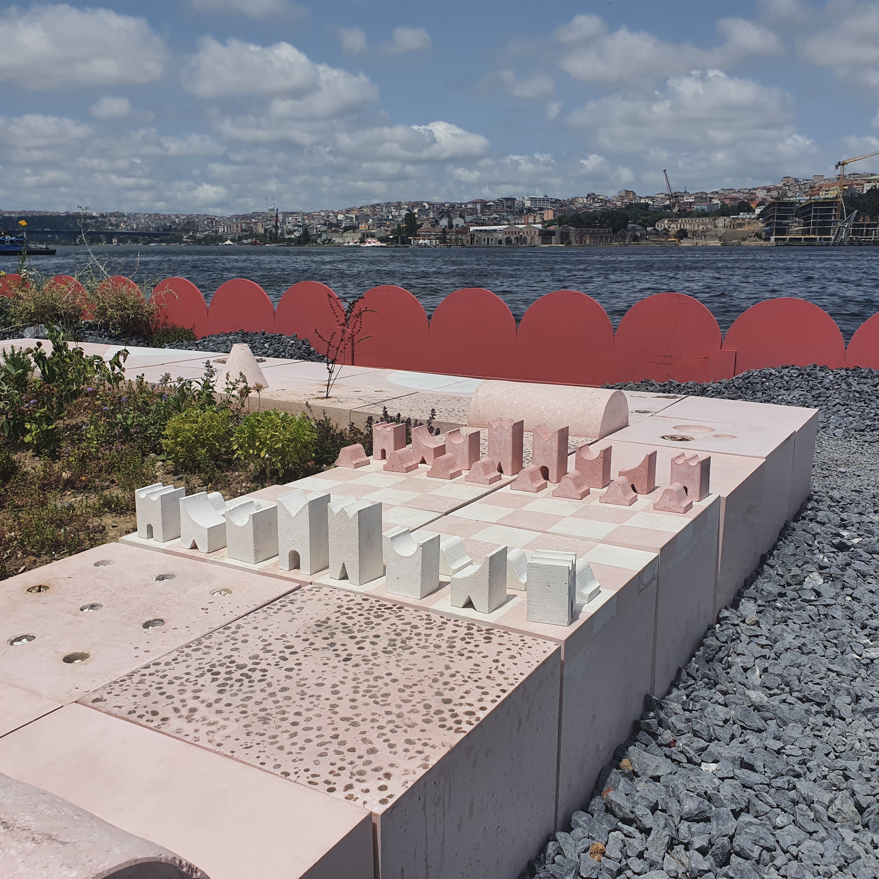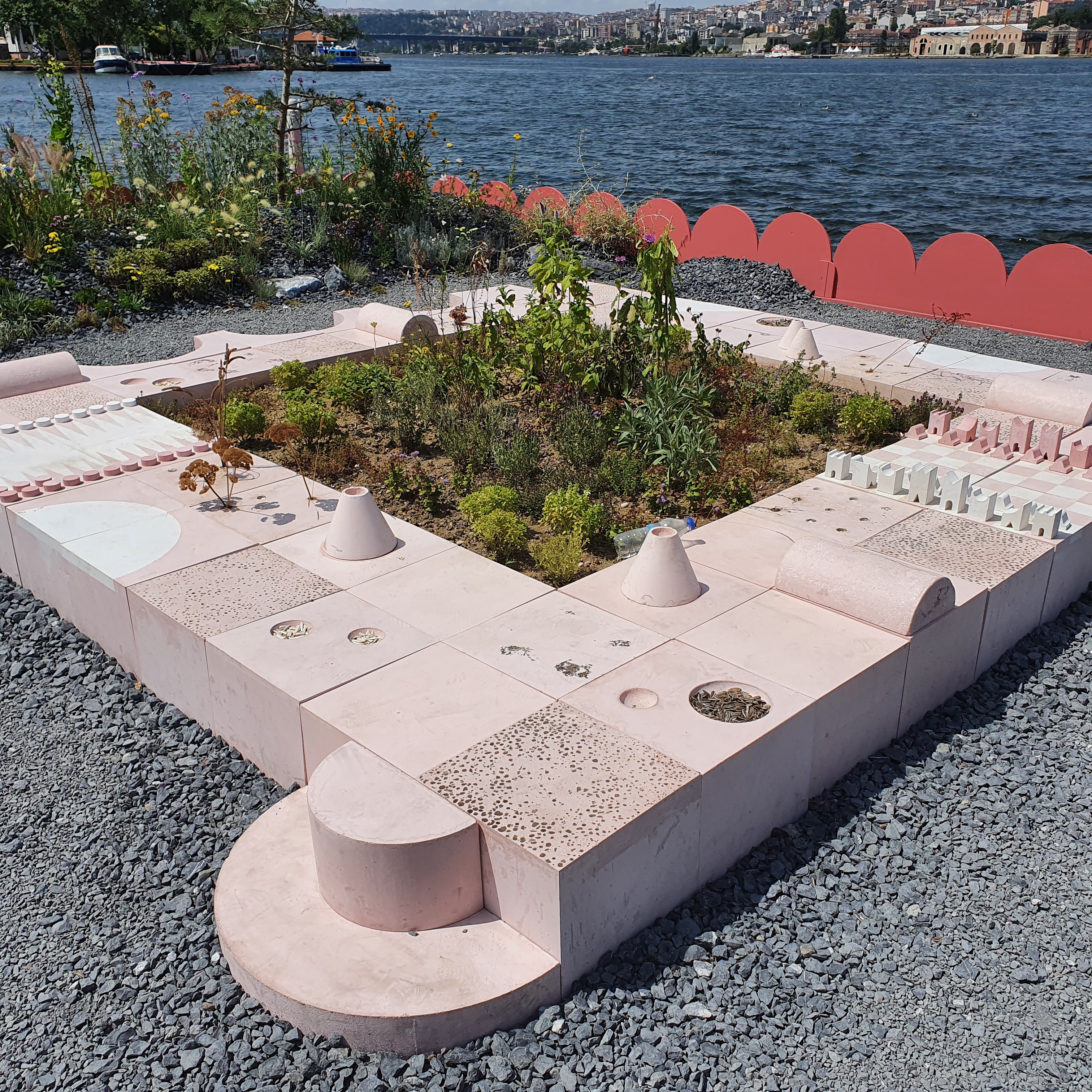 The concrete elements were produced in a pink-toned pigmented mix developed through iterative material sampling, with recipes calibrated to achieve a warm Mediterranean palette rooted in the geology of the Prince's Islands. Beyond the platform blocks, Urban Atölye also fabricated the marine terrazzo disk, a circular element cast in polished black concrete and embedded with shell terrazzo insertions using oysters, mussels, and sea urchin needles gathered from Büyükada. The disk was cast in four separate quarters and assembled on site, requiring precise coordination between formwork, casting sequence, and finishing.
